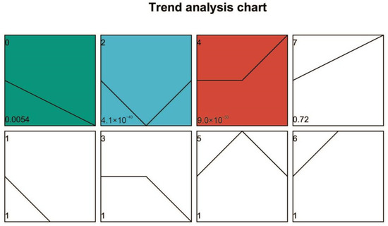 Trend analysis chart of DEGs by STEM. Note: Each profile is represented by a rectangle, with the profile number (starting from 0) in the top-left corner. The line inside the rectangle represents the expression trend over time, and the p-value indicating significance is displayed in the bottom-left corner. Colored Trend Profiles: These indicate that the temporal pattern of the profile follows a significant trend. Profiles with the same color belong to the same cluster (profiles with similar trends are grouped together). Uncolored Trend Profiles: These indicate that the temporal pattern of the profile is statistically non-significant.