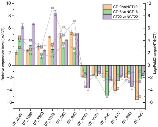 A total of six up-regulated genes (DT_22397, DT_14597, DT_10255, DT_13148, DT_3381, and DT_9081) and six down-regulated genes (DT_15188, DT_18708, DT_3595, DT_4877, DT_9523, and DT_9657) were subjected to quantitative real-time PCR (qRT-PCR) to assess expression profiles. The qRT-PCR results corresponded with transcript abundance changes revealed by DEG analysis (Figure 7), thereby confirming the reliability of the transcriptome dataset.