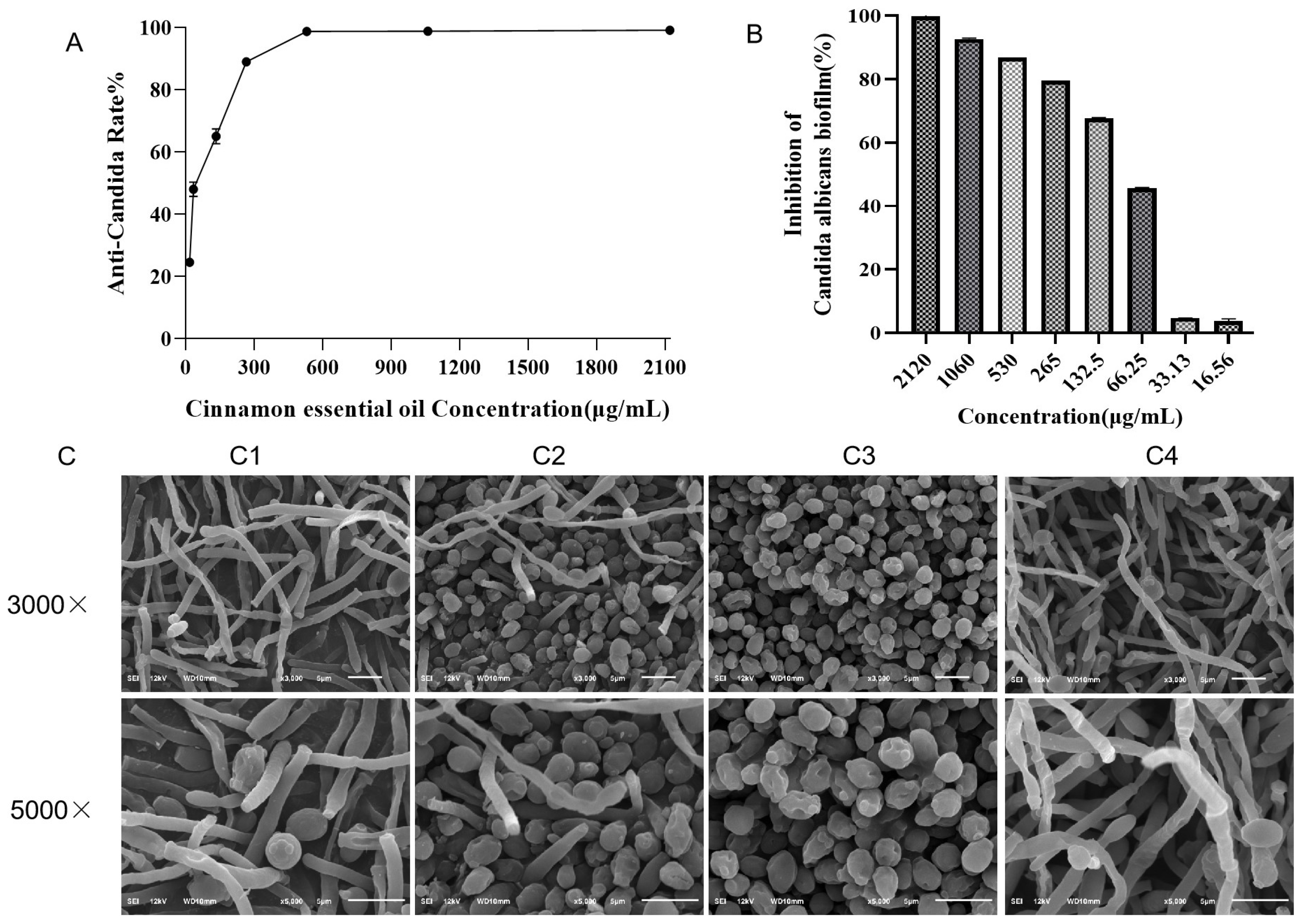 2.2. Effect of Cinnamon Essential Oil on Anti-Candida albicans Biofilm