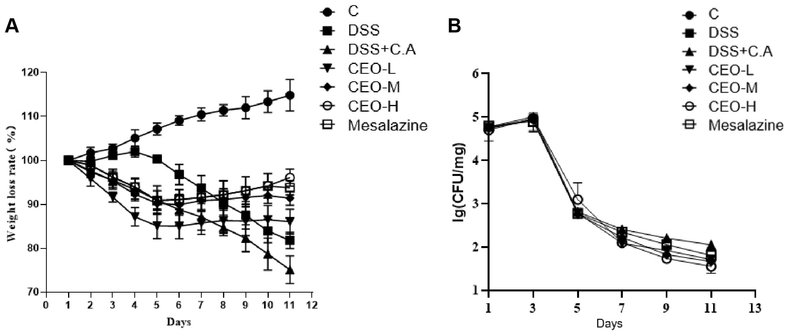 3.2. Effects of Cinnamon Essential Oil on Status and Fecal Candida albicans Load in Ulcerative Colitis Mice