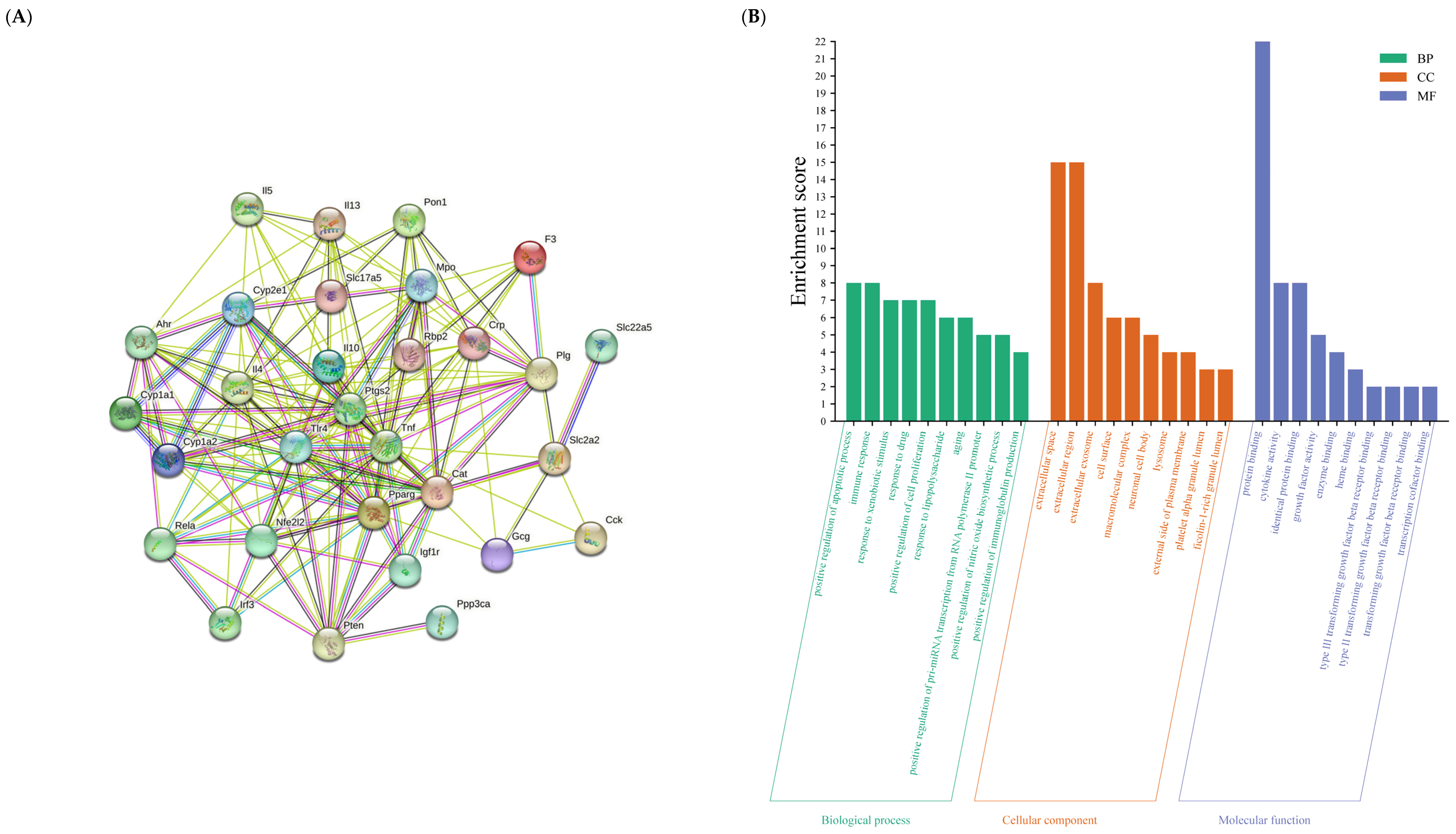 - Dai, S.; Wu, R.; Fu, K.; Li, Y.; Yao, C.; Liu, Y.; Zhang, F.; Zhang, S.; Guo, Y.; Yao, Y.; et al. Exploring the effect and mechanism of cucurbitacin B on cholestatic liver injury based on network pharmacology and experimental verification. J. Ethnopharmacol. 2024, 322, 117584. [Google Scholar] [CrossRef]