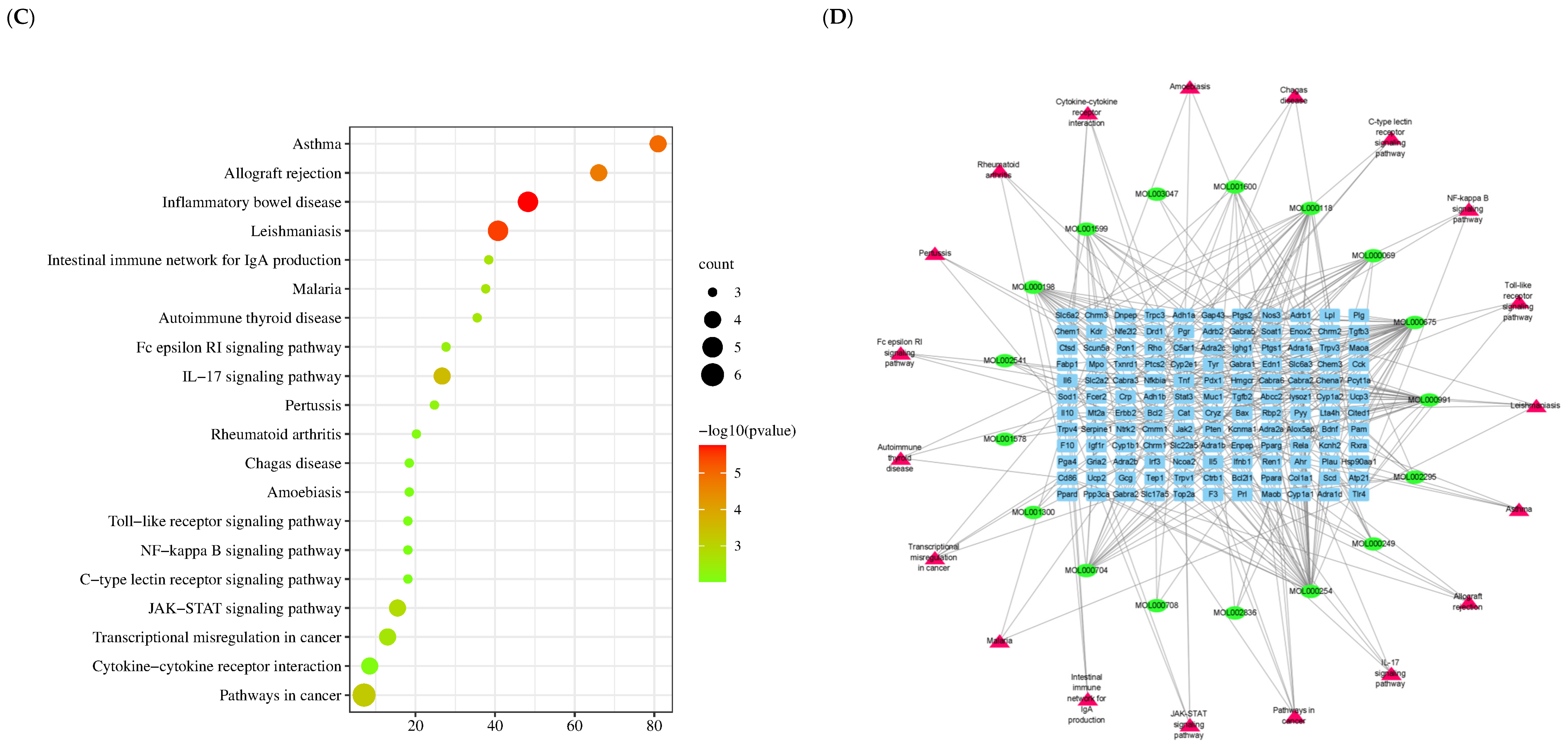 - Zhu, Z.; Liu, L.; Li, M.; Liang, N.; Liu, S.; Sun, D.; Li, W. Elucidating the Mechanism of Xiaoqinglong Decoction in Chronic Urticaria Treatment: An Integrated Approach of Network Pharmacology, Bioinformatics Analysis, Molecular Docking, and Molecular Dynamics Simulations. Curr. Comput. Aided Drug Des. 2025, 21, 1–36. [Google Scholar] [CrossRef]