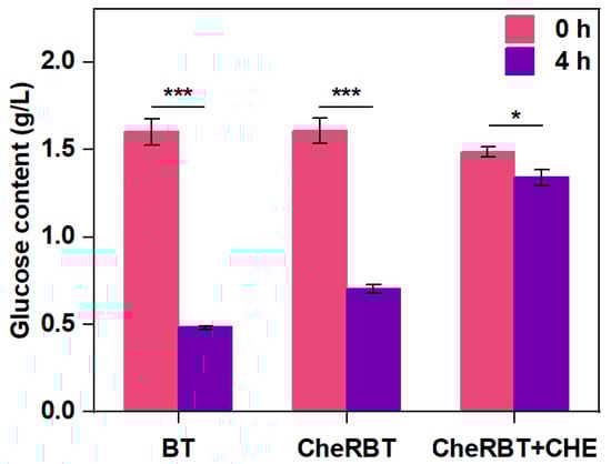 Glucose is one of the common preferred carbon sources for bacteria []. As shown in Figure 4, the two bacteria consumed glucose in different ways. After 4 h of culturing, BT consumed 70% of the available glucose, which was much faster than the rate CheRBT consumed (55.6% glucose consumed with the same period). It was interesting to see that CHE further prevented CheRBT from consuming glucose, with a consumed amount of only 10.8%. These findings indicated that at the beginning of the incubation (0–4 h), BT consumed glucose faster than CheRBT, and CHE further prevented CheRBT from consuming a similar amount of glucose as done by BT. This finding also explains the growth situation observed: the rapid growth stage of CheRBT with CHE was delayed, possibly due to the delayed glucose consumption. In brief, at the beginning of growth, BT consumed glucose faster than CheRBT, and CHE slowed down the rate at which CheRBT consumed glucose.
