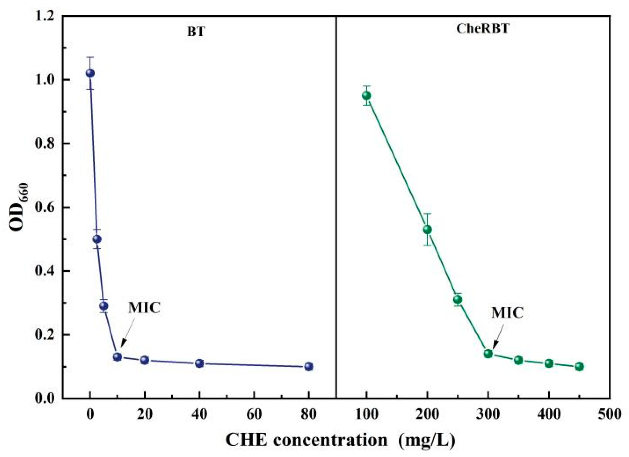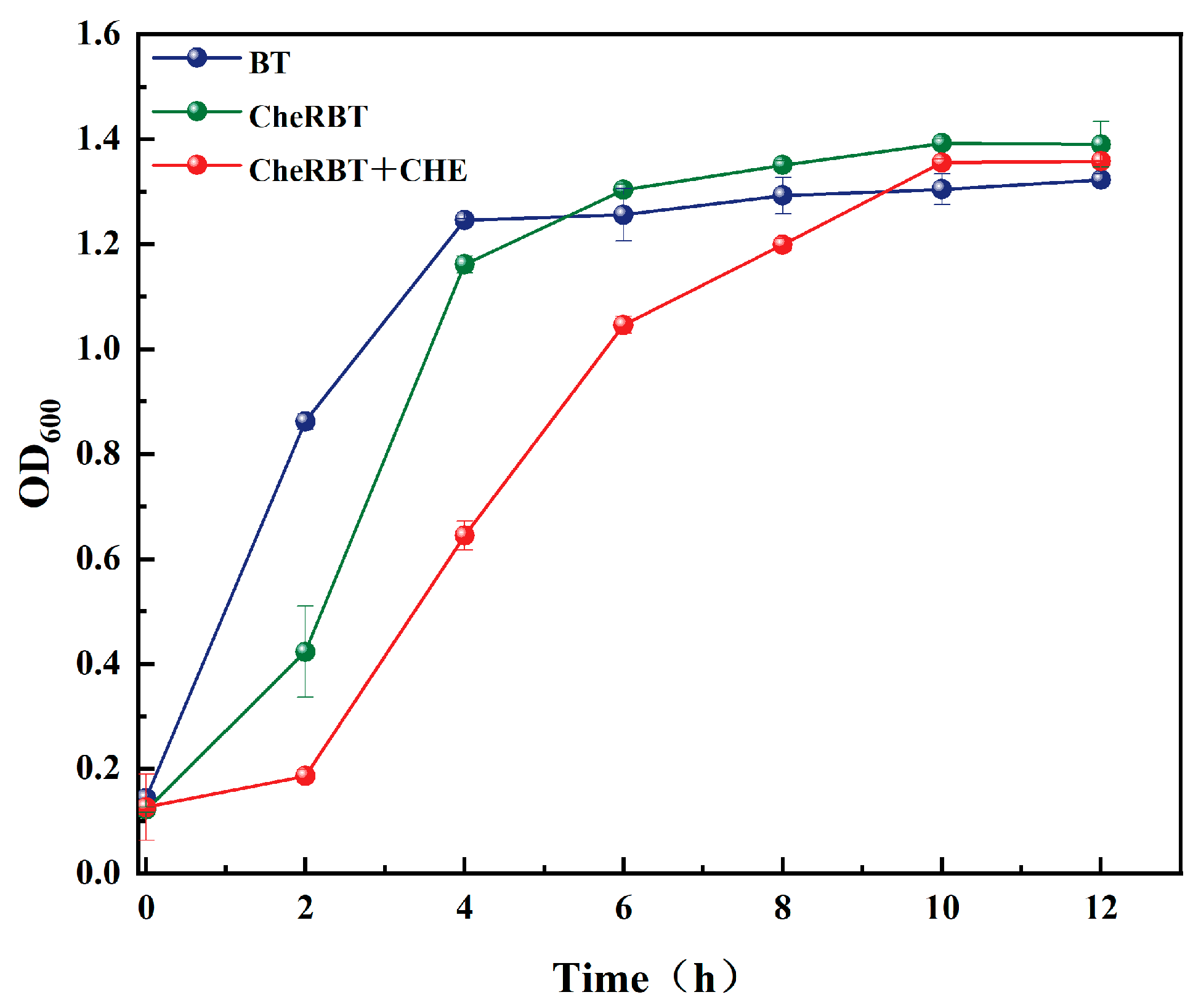 3.2.1. Growth Curve Changes in CheRBT with CHE Addition