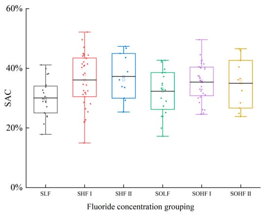 The SAC of fluoride in the sediments and riparian soils of Qingshui River is shown in Figure 2. The SAC of sediments ranges from 14.95% to 52.16%, with an average value of 34.44%, while the SAC of riparian soils ranges from 17.22% to 49.62%, with an average of 34.38%. All samples fall within a moderately stable to unstable state. Within sediments, SAC values varied among fluoride concentration groups. The highest SAC was observed in the SHF II at 37.25%, followed by the SHF I at 36.08%, and the lowest in the SLF at 30.03%. All these values consistently indicated an unstable state. This suggests that a substantial proportion of fluoride in sediments exists in an actively adsorbed speciation. Ws-F in sediments is a key driver of F− concentration in surface water. Consequently, fluoride concentrations in the Qingshui River’s surface water are significantly influenced by sediment release. For riparian soils, SAC values across fluoride concentration groups were highest in the SOHF I at 35.38%, followed by the SOHF II at 34.97%, and the SOLF at 32.30%. This indicates that a considerable proportion of fluoride in riparian soils also exists in an actively adsorbed speciation. During runoff events, a substantial amount of Ws-F from riparian soils is transported into surface water. This leaching process results in lower Ws-F content in riparian soils compared to sediments.