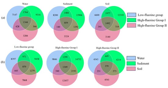 Venn of fungi under different grouping conditions. (a) presents a Venn diagram illustrating the shared and unique taxa across different fluoride concentration groups within a single habitat, and (b) depicts a Venn diagram showing the shared and unique taxa across different habitats within the same fluoride concentration group.