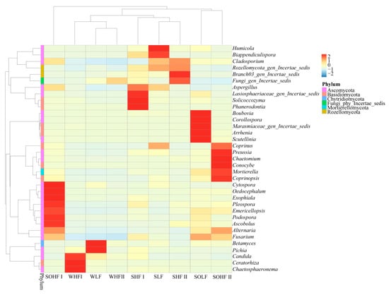 The clustering heatmap of dominant genera in different fluoride concentration groups in the Qingshui River basin is shown in Figure 7. The water, sediment, and riparian soil in the HF I differ significantly from other fluoride concentration groups, exhibiting clear clustering differences across the different habitats. Among these, fungal communities in riparian soil exhibit the greatest differences at the genus level, while fungi in sediment and water show strong similarities. A total of thirty-five genera belong to six phyla. The dominant genera (relative abundance > 1%) include four in WLF, four in WHF I, and one in WHF II; eight in SLF, six in SHF I, and six in SHF II; and eleven in SOLF, thirteen in SOHF I, and nine in SOHF II.
