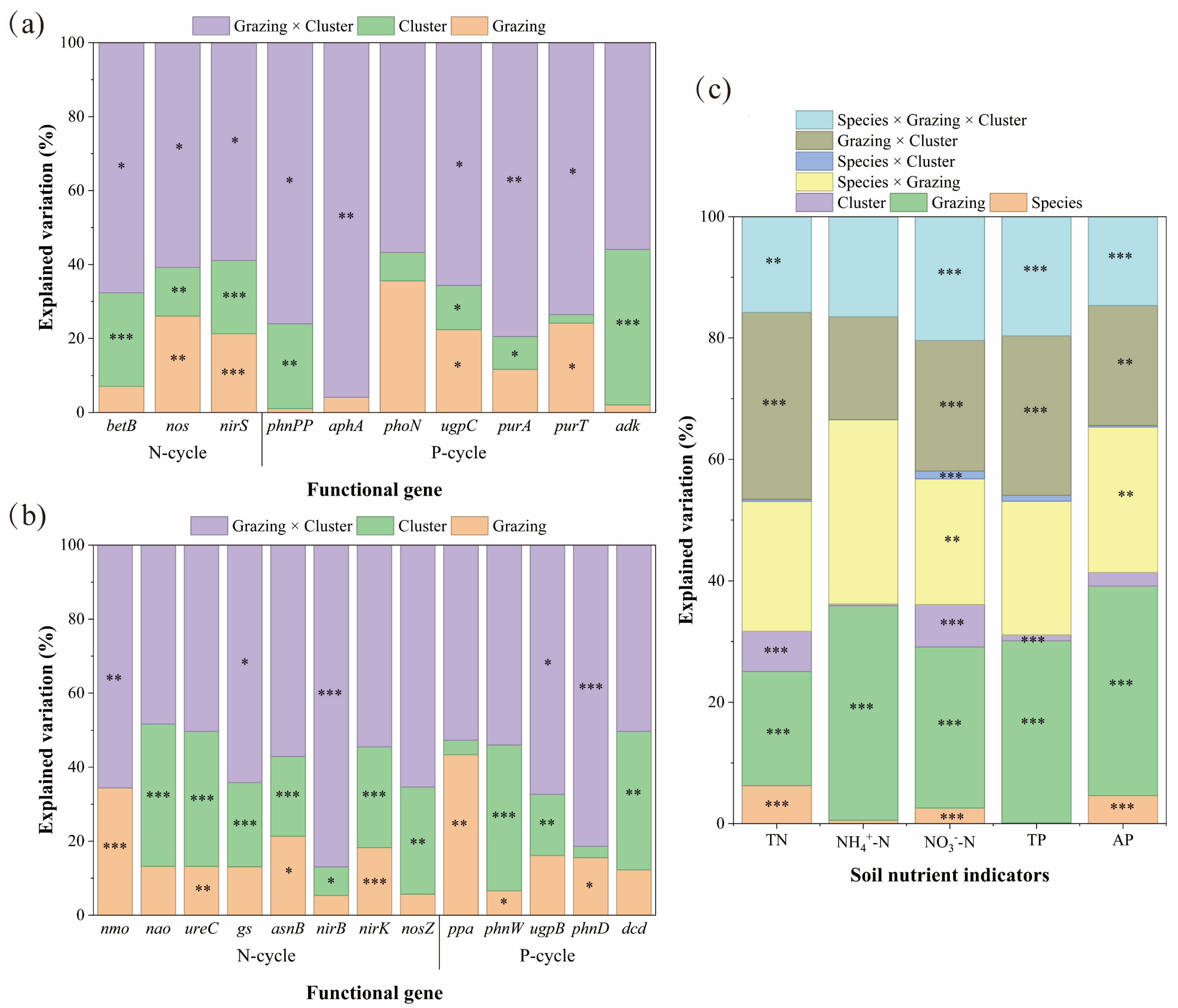 3.2. Regulatory Mechanisms of Grazing, Species, and Clusters on Functional Genes and Nutrient Indicators