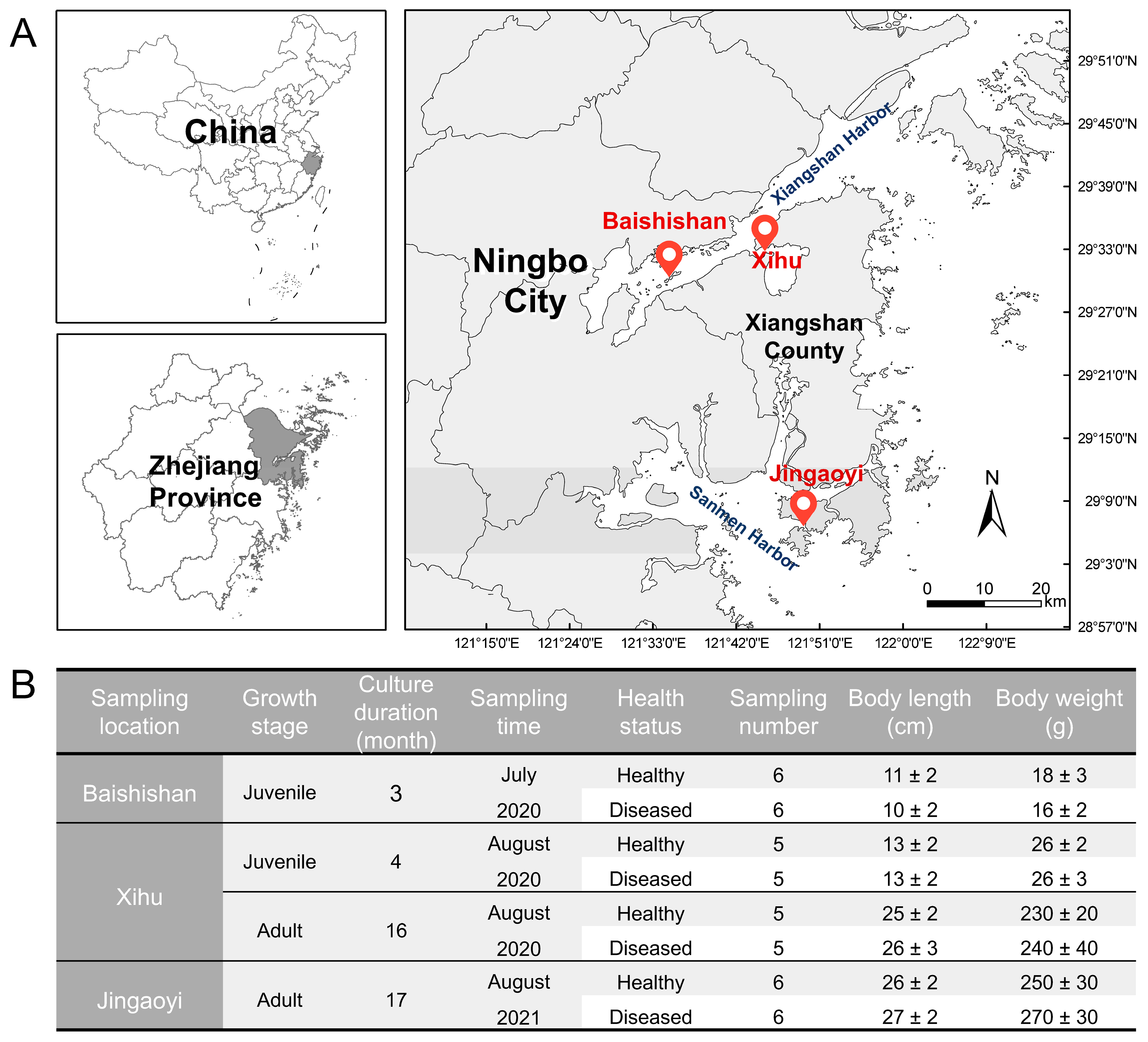 - Zhang, W.; Wen, L.; Xin, Z.; Wang, G.; Lin, H.; Wang, H.; Wei, B.; Yan, X.; Wang, W.; Guo, B. Research on the histopathology of Larimichthys crocea affected by white gill disease and analysis of its bacterial and viral community characteristics. Fish Shellfish Immunol. 2025, 161, 110287. [Google Scholar] [CrossRef] [PubMed]