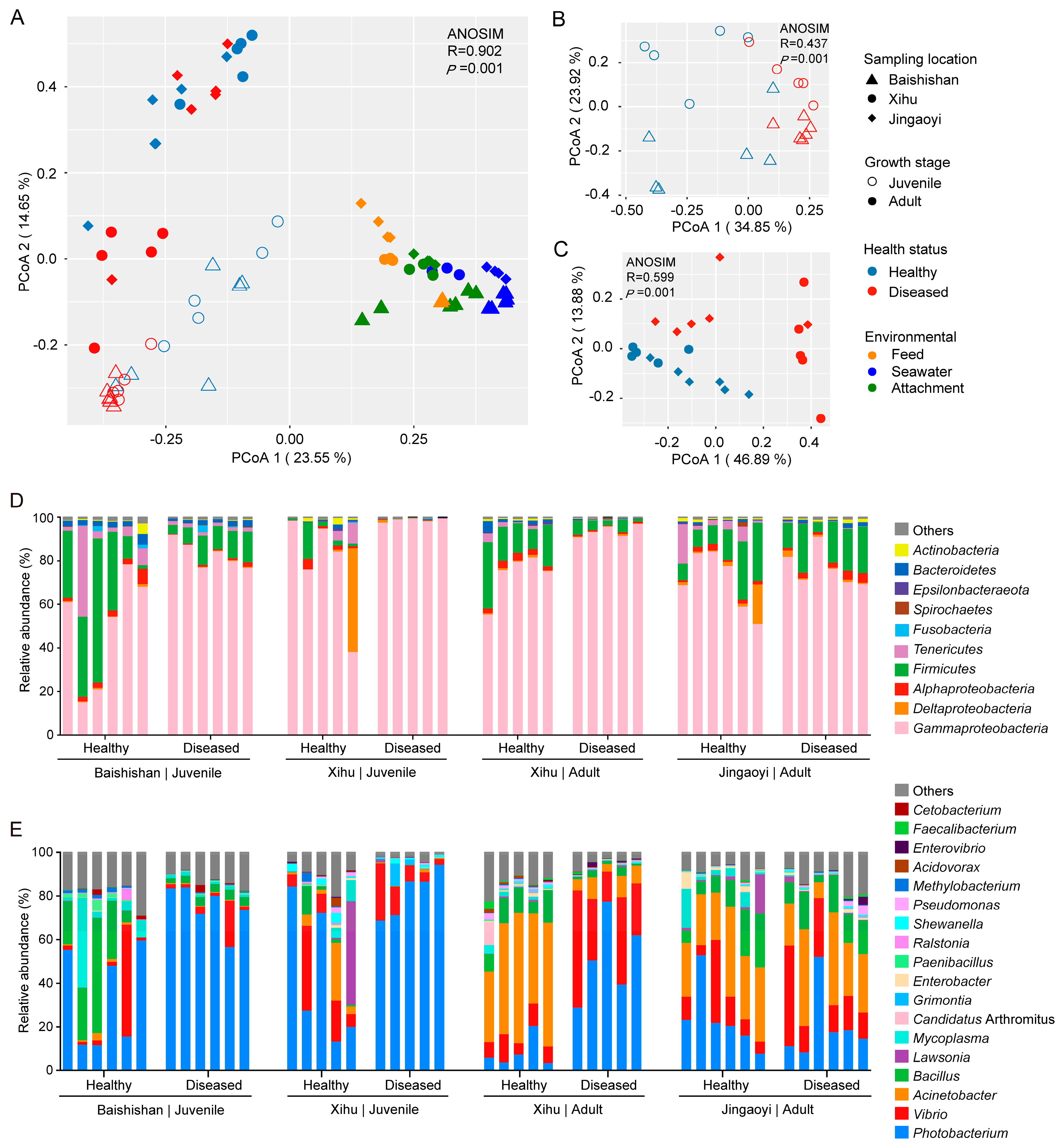 - Li, T.; Long, M.; Ji, C.; Shen, Z.; Gatesoupe, F.J.; Zhang, X.; Zhang, Q.; Zhang, L.; Zhao, Y.; Liu, X.; et al. Alterations of the gut microbiome of largemouth bronze gudgeon (Coreius guichenoti) suffering from furunculosis. Sci. Rep. 2016, 6, 30606. [Google Scholar] [CrossRef]