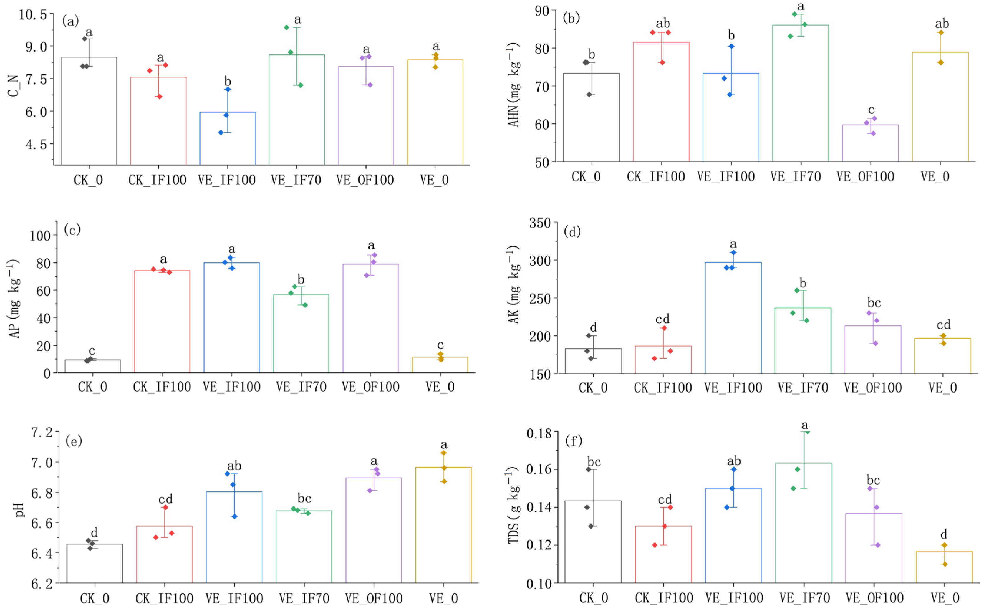 | VE_IF70 | 4.07 ± 0.30 c | 6.27 ± 0.19 ab | 3287.77 ± 106.70 b | 2.47 ± 0.05 c | 3.44 ± 0.19 c | 482.29 ± 31.56 b | 1.65 ± 0.20 c |