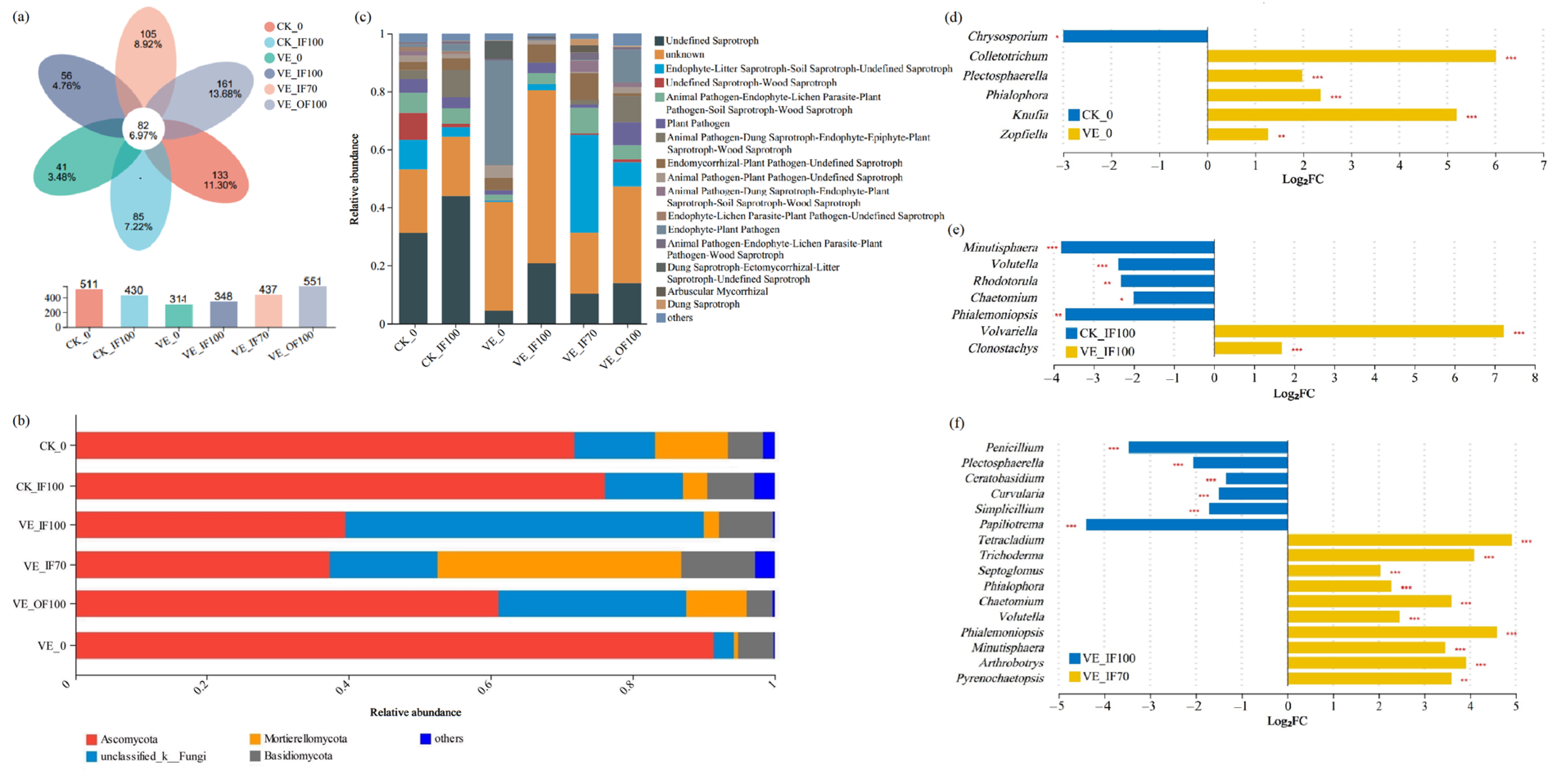 3.5. Soil Fungal Community Composition and Functions