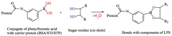 The presence of lipopolysaccharides on the cell walls of E. coli, a Gram-negative bacterium, enables the use of various types of multivalent interactions. The presence of multiple repeating carbohydrate backbones on the surface allows for the use of low-molecular-weight compounds to increase the number of complexes formed on the cell surface. Therefore, this study proposes a scheme involving a “sandwich” interaction using phenylboronic acid conjugates, which bind to cis-diols within the O-antigen on E. coli cells. The canonical structure of LPSs, specifically the O-antigen, suggests the presence of monosaccharides such as rhamnose, glucose, and galactose, as well as the presence of N-acetyl fragments of sugars. Therefore, the presence of cis-diol fragments in their structures can interact with a phenylboronic acid derivative [33] (Figure 2). Thus, in the proposed method, a BSA–aminophenylboronic acid conjugate is immobilized in the wells of a microplate. Cells are then introduced, followed by a streptavidin conjugate with the same boron derivative, a biotinylated protein, and then a streptavidin–peroxidase co-conjugate again. The biotinylated protein in this scheme acts as a “lock,” linking the two streptavidin conjugates with strong bonds. All conjugate preparations except for the commercial STP-HRP conjugate were synthesized for this work.