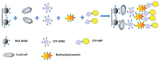 BSA-APBA conjugates with different ratios (BSA-APBA-0.5, BSA-APBA-1.0, BSA-APBA-2.0, BSA-APBA-4.0, and BSA-APBA-6.0) at a concentration of 2.0 μg/mL in 10 mM PBS were adsorbed into the wells of a microplate overnight at 4 °C. Then, the microplate was washed once with 50 mM PBT containing 0.01% Triton X-100 (PBT-1) and twice with PB. Then, a suspension of E. coli ATCC 25922 cells was added to the wells at different concentrations (from 600 to 109 cells/mL or from 10 to 108 cells/mL in PB) and incubated for 90 min at 37 °C. After washing with PBT-1 and PB, 2 µg/mL STP-APBA conjugate in PBG was added. Then, a biotinylated protein conjugate (BSA–biotin or STI–biotin at 2 µg/mL in PBG) was added and the plate was incubated for 1 h at 37 °C. After washing with PBT-1 and PB, a 1:5000 solution of STP-HRP (Imtek) in PBS was added and the plate was incubated for 1 h at 37 °C. The activity of the enzymatic label bound to the carrier was determined by adding 100 μL of a substrate solution (commercial TMB + H2O2) and stopping the reaction after 15 min with 50 μL of 0.1 M H2SO4. Optical density was measured at 450 nm.