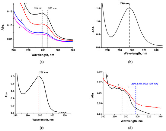 Absorption spectra of (a) BSA-APBA-1.0 (1 mg/mL) (1), BSA-APBA-2.0 (0.8 mg/mL) (2), BSA-APBA-4.0 (0.5 mg/mL) (3), BSA-APBA-6.0 (0.5 mg/mL) (4); (b) APBA (1 mg/mL); (c) BSA (1 mg/mL); (d) STP-APBA (1) and STP (2).