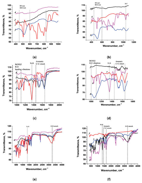 FT-IR spectra of conjugates and native components: (a,c,e) BSA (1), APBA (2), BSA-APBA (Tris) (3), and BSA-APBA (MES) (4); (b,d,f) STP (5), APBA (6), STP-APBA (Tris) (7), and STP-APBA (MES) (8). Spectra are shown for the wavenumber ranges of 400–1100 cm−1 (a,b), 1000–2000 cm−1 (c,d), and 400–4000 cm−1 (e,f).
