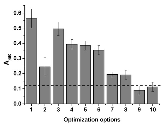 Histogram showing optical density at 450 nm vs. cell concentration (106 cells/mL) under different assay conditions. 1—STP-APBA (Tris), PBG; 2—STP-APBA (Tris), PBT-1; 3—STP-APBA (MES), PBG; 4—STP-APBA (MES), PBT-1; 5—STP-APBA (MES), PBG, blocking with 1% BSA; 6—STP-APBA (MES), PBT-1, blocking with 1% BSA; 7—STP-APBA (MES), PBG, blocking with 1% BSA, 0.1 mg/mL glycerin in water; 8—STP-APBA (MES), PBG, blocking with 1% BSA, 0.1 mg/mL mannose in water; 9—no STP-APBA; 10—no STI–biotin. The dashed line indicates the background absorbance.