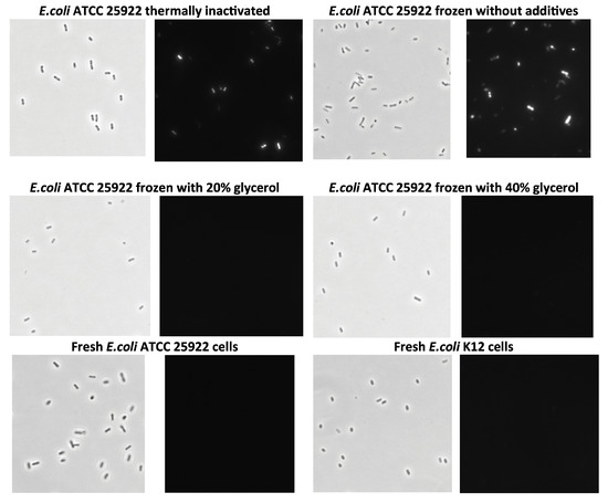 A comparison of the cell inactivation and storage methods was also conducted using propidium iodide staining of bacteria and fluorescence microscopy [58] (Figure 8). Phase-contrast images show that the bacteria retained their morphology despite the various preparation methods. Therefore, a fluorescence microscope was used to assess the staining potential, as only non-viable cells can be stained with propidium iodide. It was evident that the cells ceased to be viable upon heat inactivation and freezing in buffer. However, they remained viable even when frozen at −20 °C in the presence of glycerol.