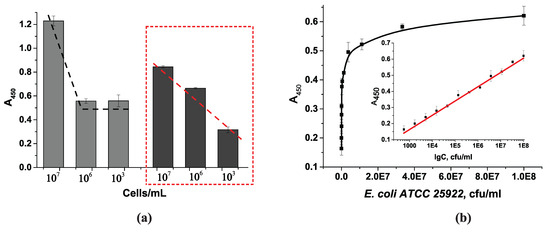 Based on preliminary interaction optimization, the parameters and conditions were selected. During optimization, the standard time for the enzymatic reaction of TMB oxidation using horseradish peroxidase as a label in the assay was used. The standard 15 min TMB oxidation time yielded slightly higher optical density values (approximately 1.2 at 450 nm with 107 cells/mL), but it also increased background staining, leading to a reduction in the range of detection for cell concentrations and a detection limit of 106 cells/mL for E. coli (Figure 9a, gray columns). Reducing the TMB oxidation time to 3 min produced low background values while maintaining a maximum optical density of approximately 0.9–1.0 at 450 nm with 107 cells/mL (Figure 9a, light gray columns).