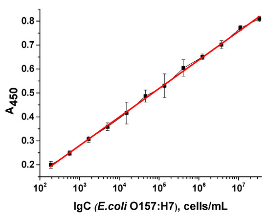 The optical density at 450 nm vs. the cell concentration or logarithm of E. coli cell concentration in the microplate wells was plotted and statistically analyzed using Origin 9.0 software (Northampton, MA, USA). The results were calculated using a 4 PL (4 Parameter Logistic) curve fit at https://www.aatbio.com/ (accessed on 19 November 2025).