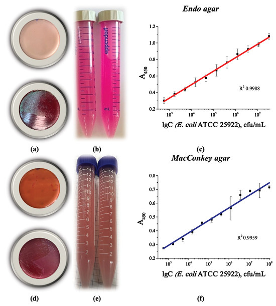 Appearance of a Petri dish with (a) Endo agar and (d) MacConkey agar before (top) and after (bottom) the growth of E. coli ATCC 25922 colonies; appearance of a cell suspension collected from the surface of (b) Endo agar and (e) MacConkey agar; optical density vs. logarithm of E. coli ATCC 25922 cell concentration after growth on (c) Endo agar and (f) MacConkey agar. The linear curves are from four replicates.