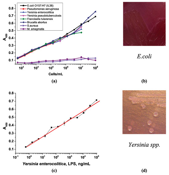 Optical density vs. logarithm of the concentration of (a) pure cell cultures in buffer and (c) LPSs of Yersinia enterocolitica. The appearance of (b) E. coli colonies and (d) Yersinia spp. on MacConkey agar.