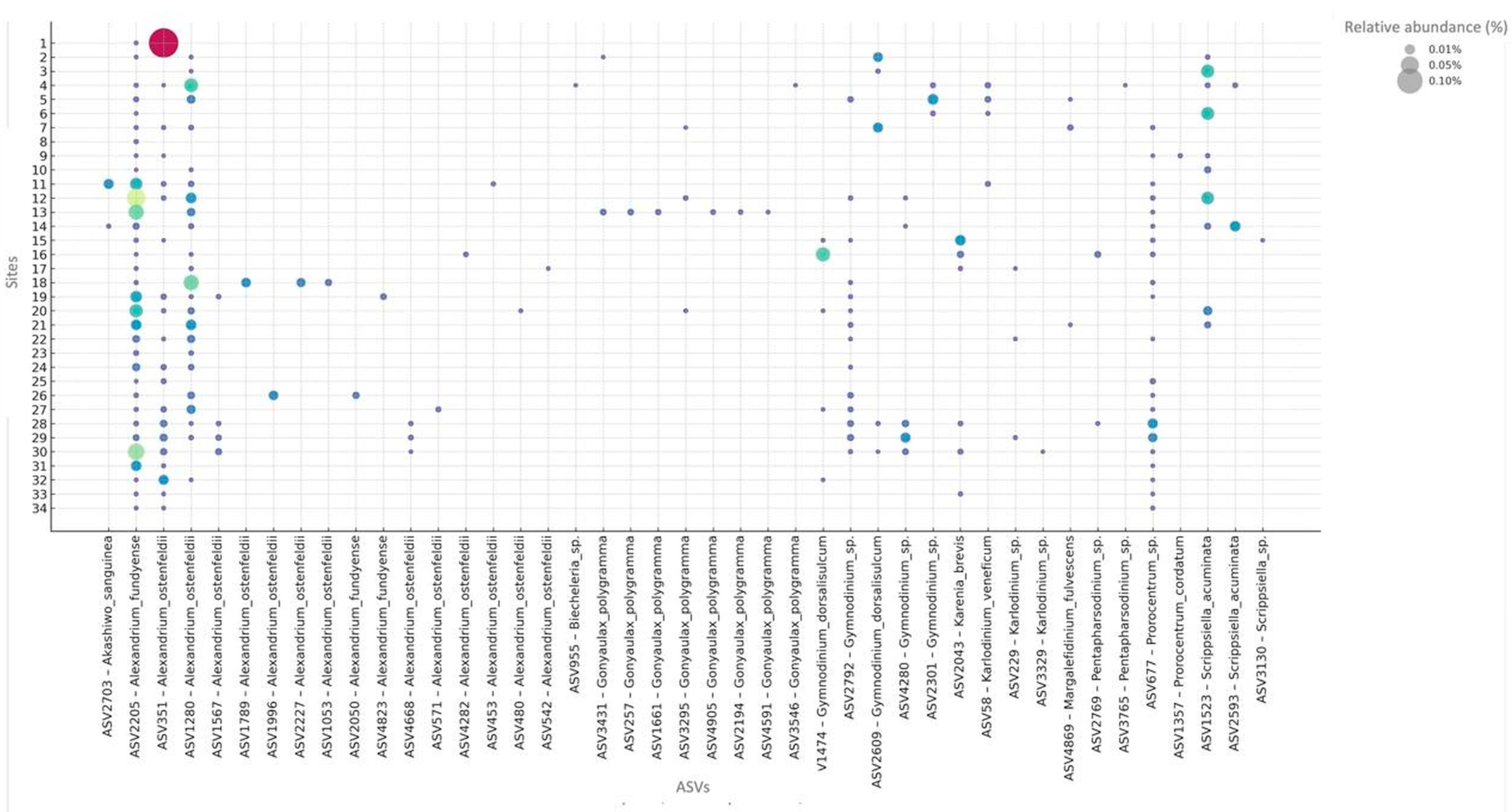 - Sildever, S.; Nishi, N.; Inaba, N.; Asakura, T.; Kikuchi, J.; Asano, Y.; Kobayashi, T.; Gojobori, T.; Nagai, S. Monitoring harmful microalgal species and their appearance in Tokyo Bay, Japan, using metabarcoding. Metabarcoding Metagenom. 2022, 6, 261–280. [Google Scholar] [CrossRef]
