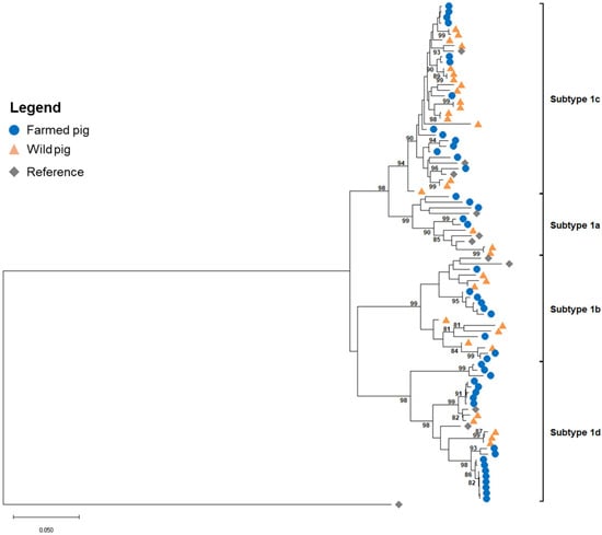 Sequences from both wild and farmed pigs were distributed across all four subtypes, although some subtypes were more prevalent in one population than the other. Subtype 1c was the most frequently observed, appearing in both domestic and wild pigs across multiple locations, and subtype 1a was the least represented, with only a few sequences in each population.