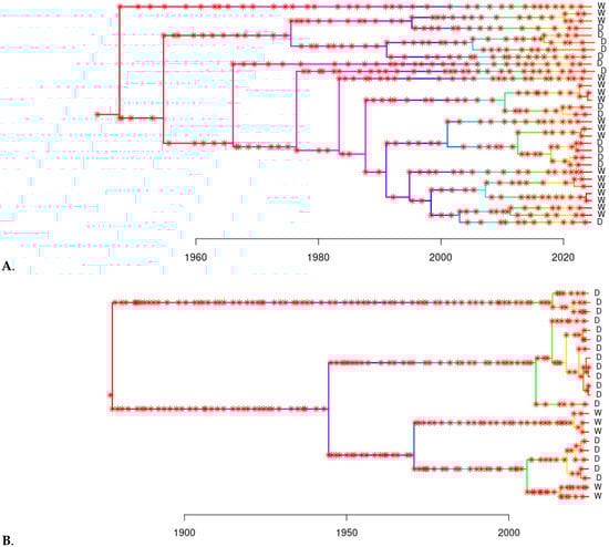 Consensus transmission trees inferred for Clade 1 (A) and Clade 3 (B) of the TTSuV1 time-dated tree. Each tree represents the most probable transmission history among sampled individuals within the clade, based on dated phylogenies and a Bayesian transmission model. Tips represent individual pigs sampled in this study, and asterisks represent inferred transmission events based on both within host evolution and evolution that occurred during transmission events. Tip labels are annotated with “D” for domestic pigs and “W” for wild pigs. Each tree was inferred independently based on the clade-specific MCC tree from BEAST2.