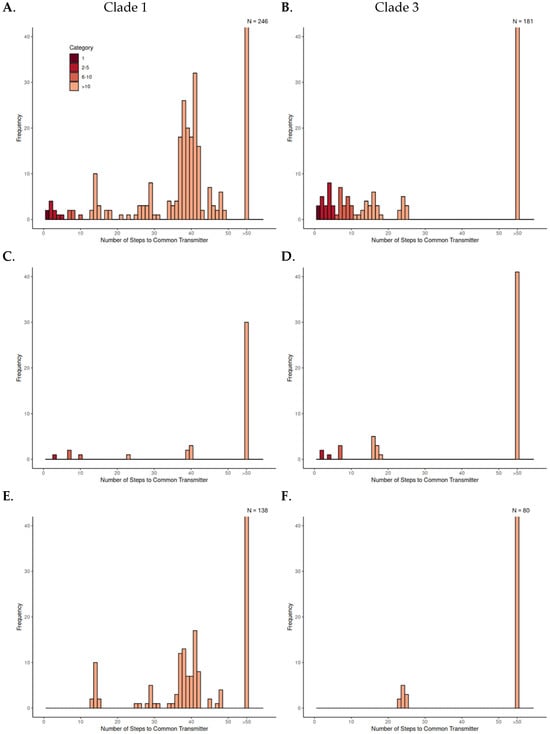 Histograms of inferred pairwise transmission steps between sample pairs within Clade 1 and Clade 3. Each panel shows the distribution of pairwise transmission steps: (A,B) all sample pairs within the clade; (C,D) pairs between the source farm and other farms; and (E,F) pairs between farmed and wild pigs. Bars are colored according to few, moderate, and numerous step categories. The final bin (“>50”) represents all pairs with more than 50 steps. The y-axis is truncated at 40 to enhance the visibility of smaller bars; the actual count of the “>50” bin exceeds the displayed maximum and is indicated above the bar (e.g., N = 246).