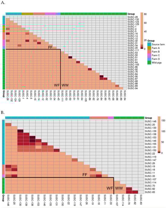 Heatmaps of pairwise transmission steps between individuals in two major clades. (A): Clade 1; (B): Clade 3. Cells are colored according to step intervals: 1 step (dark red), 2–5 steps (red), 6–10 steps (orange), and more than 10 steps (light beige). Tip labels are ordered by group. The color legend reflects these categories for easier interpretation of the transmission structure. The upper triangle of the symmetric matrix was masked for clarity, and the lower triangle was divided into three sections: farm–farm (FF) pairs, wild–farmed (WF) pairs, and wild–wild (WW) pairs.