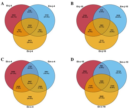 Venn diagram showing the number of unique and shared core OTUs in the microbial content of jejunum and cecum. Core OTUs of jejunum (A,B) at 4 and 10 dpi with E. tenella, E. maxima, E. necatrix group and control group. Core OTUs of cecum (C,D) at 4 and 10 dpi with E. tenella, E. maxima, E. necatrix group and control group.