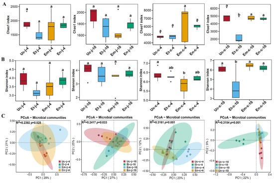 Alpha diversity and Principal coordinate analysis between different groups. (A) Chao1 index, (B) Shannon index. (C) Principal coordinate analysis between 4 groups. Different letters on the bar graph represent significant differences between groups (p < 0.05).