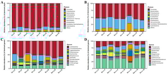 The gut microbiota structure of the jejunum and cecum at the phylum (A,B) and Genus (C,D) level of at 4 and 10 dpi with E. tenella, E. maxima and E. necatrix and control groups.