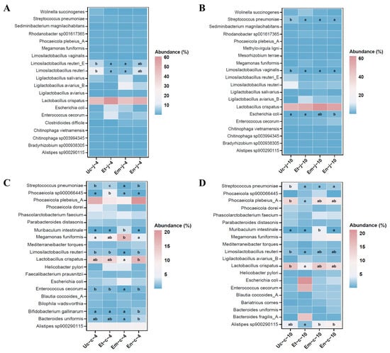 Significant differences in the abundance of the top 20 species in the jejunum (A,B) and cecum (C,D) microbiota at 4 and 10 dpi with E. tenella, E. maxima, and E. necatrix. Different letters on the bar graph represent significant differences between groups (p < 0.05).