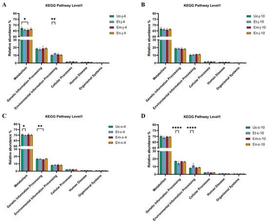 Functional prediction analysis of microbiota in jejunal (A,B) and cecal (C,D) contents of chickens. *, p < 0.05, **, p < 0.01, and ****, p < 0.0001.