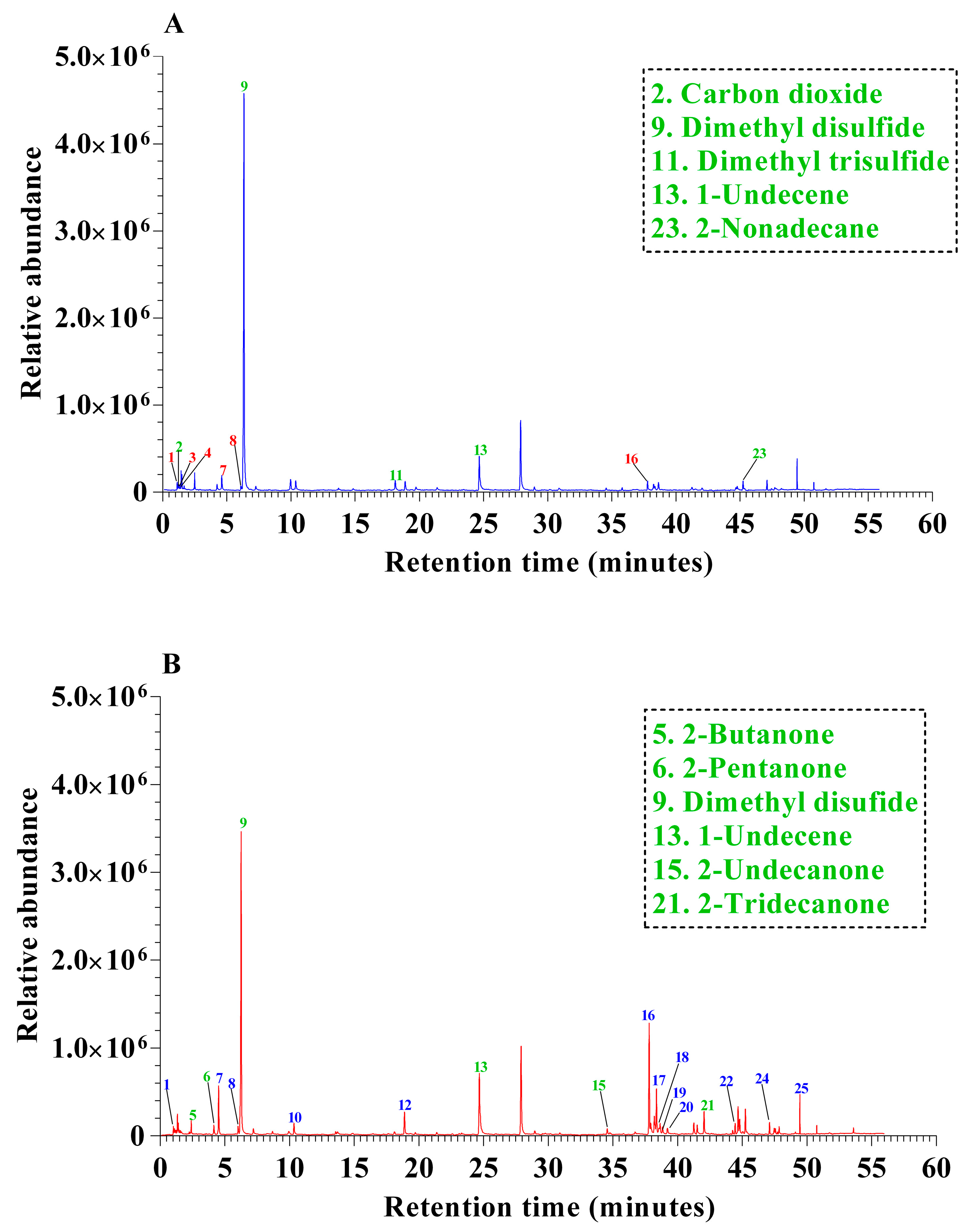 - Chen, J.; Tang, J.; Shi, H.; Tang, C.; Zhang, R. Characteristics of volatile organic compounds produced from five pathogenic bacteria by headspace-solid phase micro-extraction/gas chromatography-mass spectrometry. J. Basic Microbiol. 2017, 57, 228–237. [Google Scholar] [CrossRef]