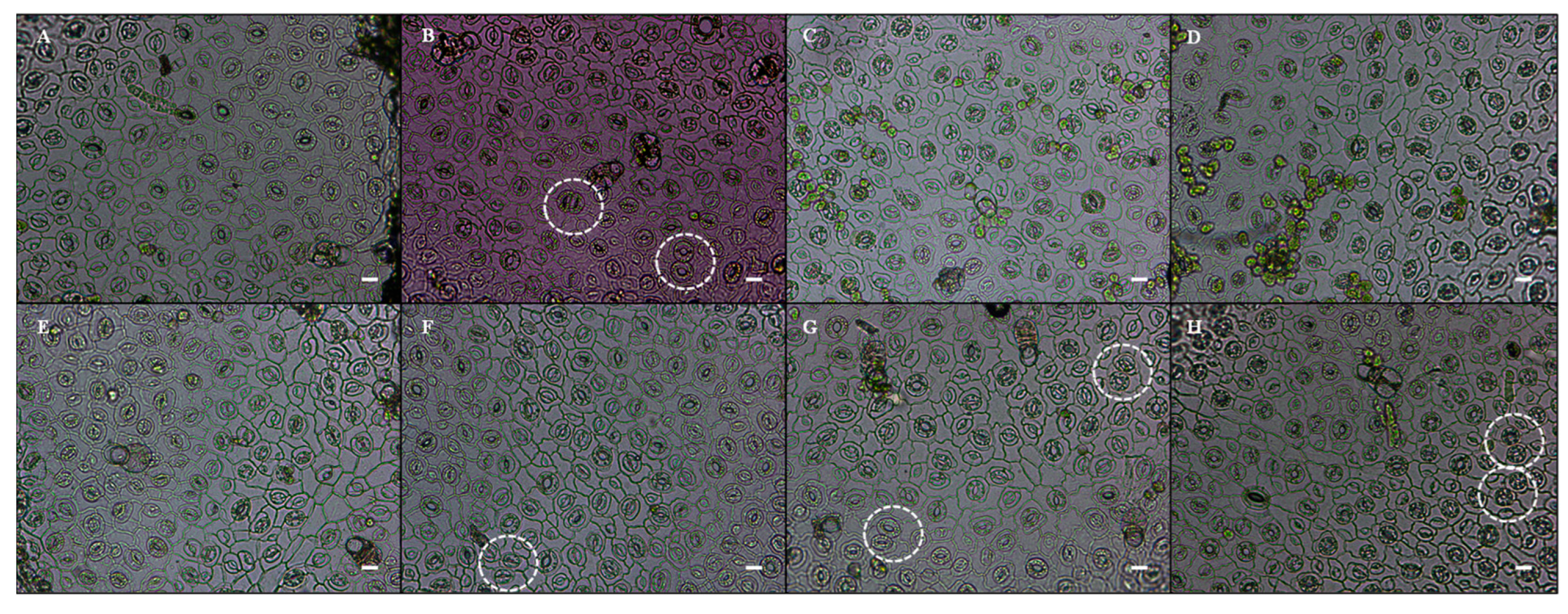| Treatment | Length of Guard Cell (µm) | Width of Guard Cell (µm) | Stomatal Density (n/mm2) | Closed Stomata (n/mm2) |