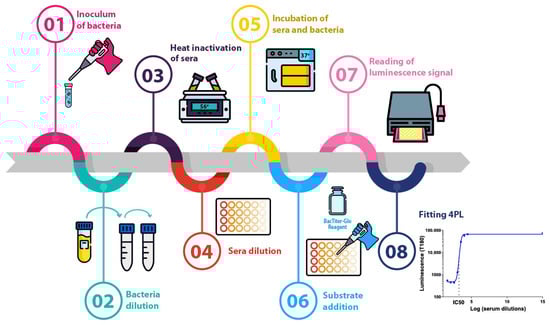 SBA based on luminescent readout (L-SBA) was performed, adapting the same protocol used to determine functionality against vaccine-homologous strains [37,38], as reported in Figure 1. Briefly, a 3-fold dilution step up to 7 dilution points of HI test sera and 1 control well with no sera were incubated in the presence of exogenous complement (BRC, 50% for all S. Typhimurium and Enteritidis strains, 5% for S. Derby, 15% for S. Dublin, and 20% for all S. Paratyphi A strains) and bacteria (approximately 2 × 104 CFUs/mL from log-phase cultures stopped at OD600 = 0.22 ± 0.03 [51]) in a final reaction volume of 100 µL/well. The starting dilution of each serum in the assay was adapted on the basis of parameters assayed: 1:20 for all S. Paratyphi A strains, 1:100 for S. Derby and for all S. Typhimurium strains tested, 1:500 for S. Dublin, 1:1000 for S. Enteritidis A1636 and D7795, 1:2000 for S. Enteritidis CMCC4314 in case of repeatability and intermediate precision, linearity, and homologous and heterologous precision assessment, and 1:4 for all strains in case of limit of detection and limit of quantification assessment.