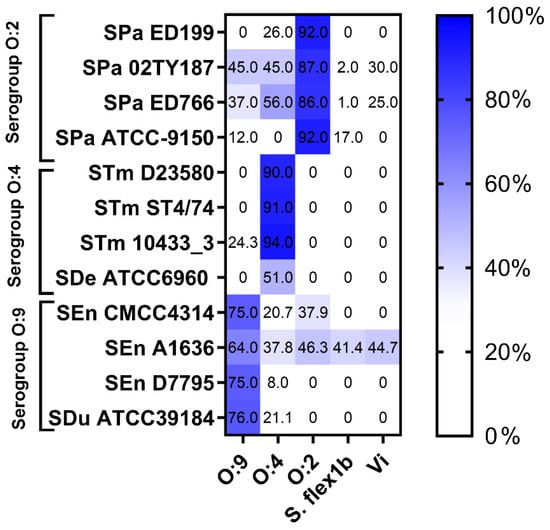 In preparation to assess the bactericidal activity of vaccine-induced antibodies against Salmonella, a panel of epidemiologically relevant clinical isolates with different OAg acetylation/glucosylation profiles belonging to serogroups O:2, O:4, and O:9 [41,42,43,44,45,46] was selected, and the performance of the L-SBA was evaluated. In particular, for serogroup O:2, four S. Paratyphi A isolates with acetylation ranging from 17 to 100% and glucosylation from 51 to 20% were selected; for serogroup O:9, three S. Enteritidis isolates and one S. Dublin, with O-acetylation ranging from 8 to 60% and glucosylation from 13 to 21%; for serogroup O:4, three S. Typhimurium isolates with O-acetylation around 120% and glucosylation ranging from 18 to 62% and S. Derby, with O-acetylation <28% and a glucosylation of 18% (Table 1).
