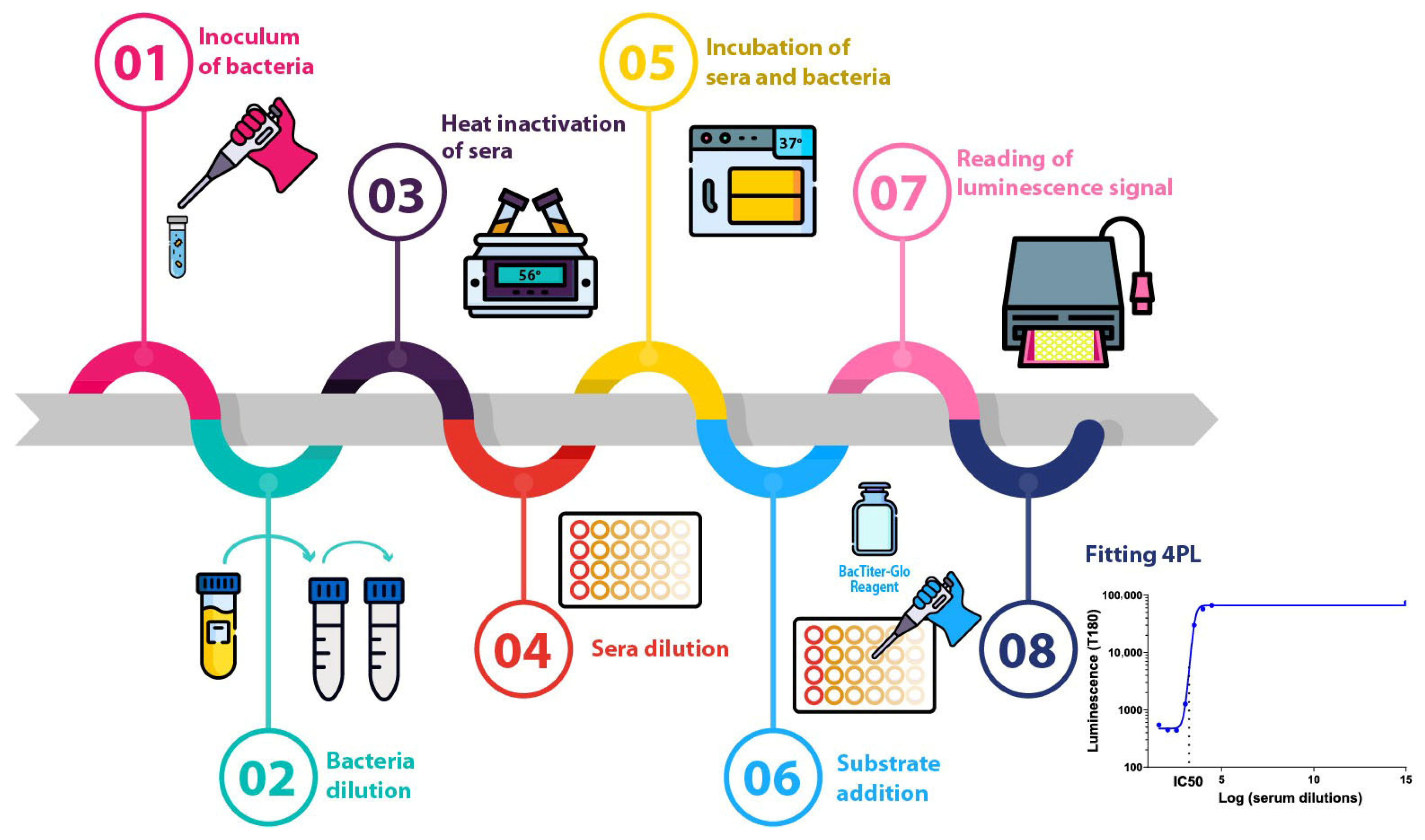 - Aruta, M.G.; De Simone, D.; Dale, H.; Chirwa, E.; Kadwala, I.; Mbewe, M.; Banda, H.; Gordon, M.; Pizza, M.; Berlanda Scorza, F.; et al. Development and Characterization of a Luminescence-Based High-Throughput Serum Bactericidal Assay (L-SBA) to Assess Bactericidal Activity of Human Sera against Nontyphoidal Salmonella. Methods Protoc. 2022, 5, 100. [Google Scholar] [CrossRef]