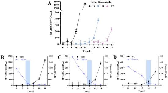 Dynamic response of the glucose-responsive element to glucose depletion in strain CGY1. (A) Time–relative fluorescence unit (RFU) profile in strain CGY1 cultured with different initial glucose concentrations. Time–RFU–glucose concentration profile at an initial glucose concentration of (B) 4 g/L, (C) 8 g/L, and (D) 16 g/L. Rectangular boxes in all panels indicate the occurrence of fluorescence inflection points.
