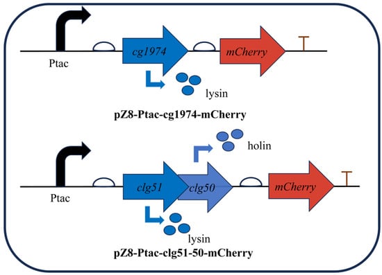 To validate the lytic activity of these elements, the lysis genes were fused to the reporter gene mCherry and cloned downstream of the IPTG-inducible tac promoter on the plasmid pZ8-Ptac (Figure 3). The resulting plasmids were then transformed into wild-type C. glutamicum to generate strains CGY2::pZ8-Ptac-cg1974-mCherry and CGY3::pZ8-Ptac-clg51-50-mCherry, respectively.