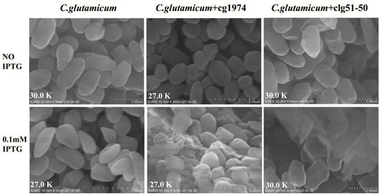 SEM images of C. glutamicum cells following induction with 0.1 mM IPTG, captured at 27,000× and 30,000× magnification.
