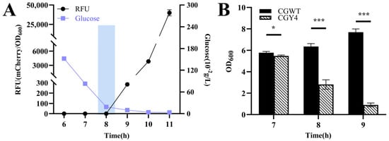 Validation of the controllable glucose-responsive lysis system in C. glutamicum CGY4. (A) Time–RFU–glucose concentration profile at an initial glucose concentration of 4 g/L. The rectangular box indicates the fluorescence inflection point at 8 h, corresponding to glucose depletion to the critical threshold (~0.19 g/L). (B) Magnified view of cell density changes for CGY4 and the wild-type control during the critical transition period. Statistical significance was determined using Student’s t-test: * p < 0.05, *** p < 0.001.