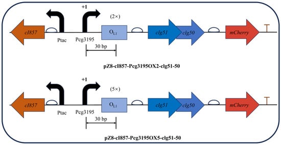 Building upon the validated temperature-responsive vector pZ8-cI857-CJ1OX2, a modified construct was generated by replacing the CJ1 promoter with the cg3195 promoter, while retaining the upstream cI857 repressor expression cassette. Considering the DNA footprint of an elongating RNA polymerase, two (38 bp in total) or five (101 bp in total) OL1 operator sequences were precisely inserted 30 bp downstream of the Pcg3195 transcription start site (TSS, +1) within the non-coding region. The resulting recombinant plasmids, pZ8-cI857-Pcg3195OX2-clg51-50 and pZ8-cI857-Pcg3195OX5-clg51-50, maintained the structural integrity of the downstream clg51-50–mCherry expression cassette (Figure 9).