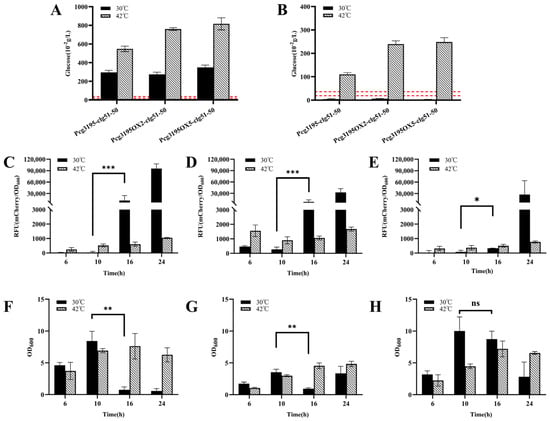 As shown in Figure 10A, during cultivation at 30 °C, the glucose concentration in the broth of all three recombinant strains decreased below the threshold by 16 h. However, both mCherry fluorescence measurements (Figure 10C–E) and changes in cell density (Figure 10F,G) indicated that the lysis module was activated even in the absence of temperature induction, which deviated from the intended AND-gate control design. In contrast, when a temperature upshift to 42 °C was applied at 6 h, the residual glucose concentration at 16 h remained significantly higher than the threshold (Figure 10B), and the bacterial growth continued to increase (Figure 10F–H), implying that the glucose-responsive switch was not triggered at this stage.