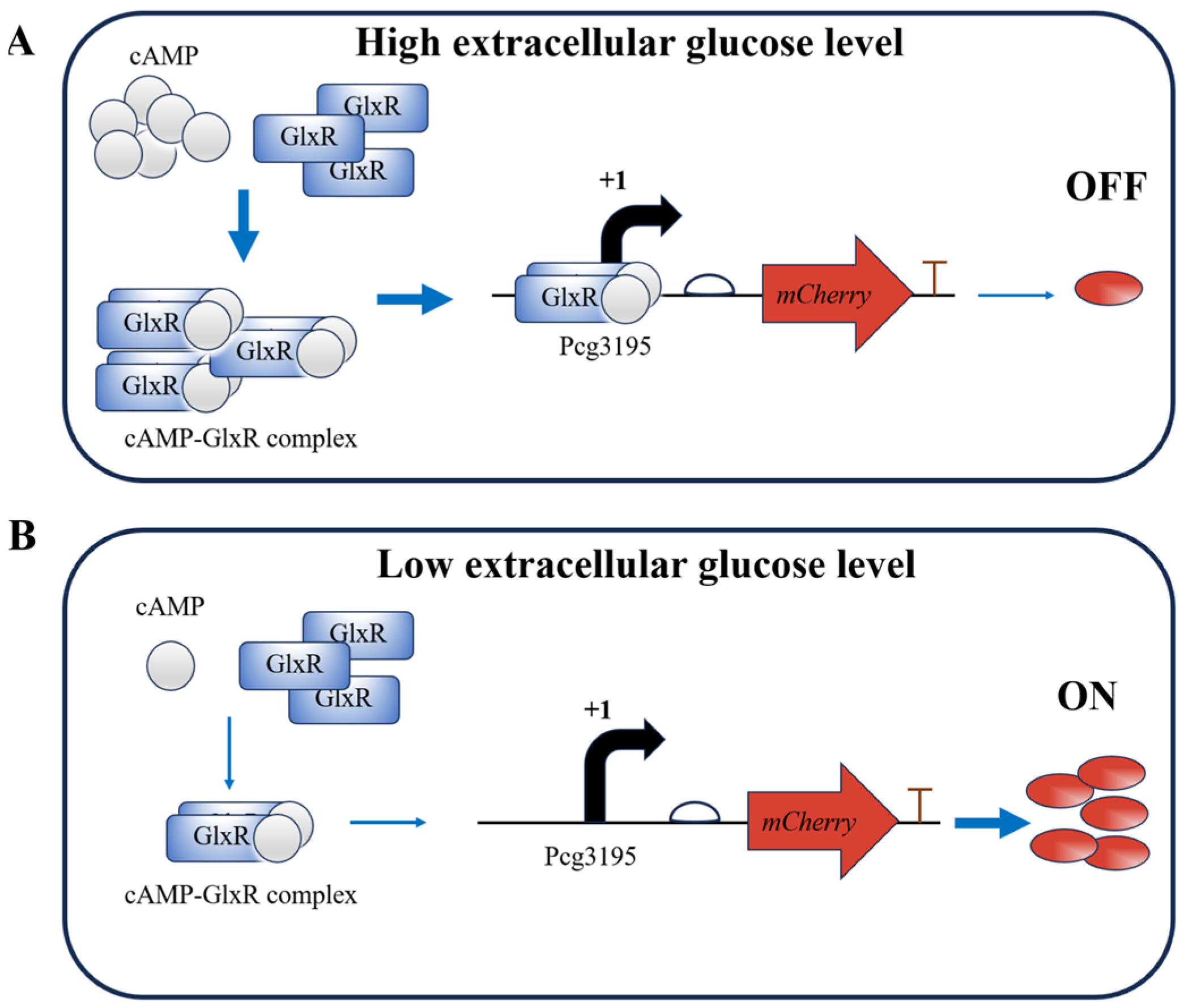 - Schulte, J.; Baumgart, M.; Bott, M. Development of a Single-Cell GlxR-Based cAMP Biosensor for Corynebacterium glutamicum. J. Biotechnol. 2017, 258, 33–40. [Google Scholar] [CrossRef] [PubMed]