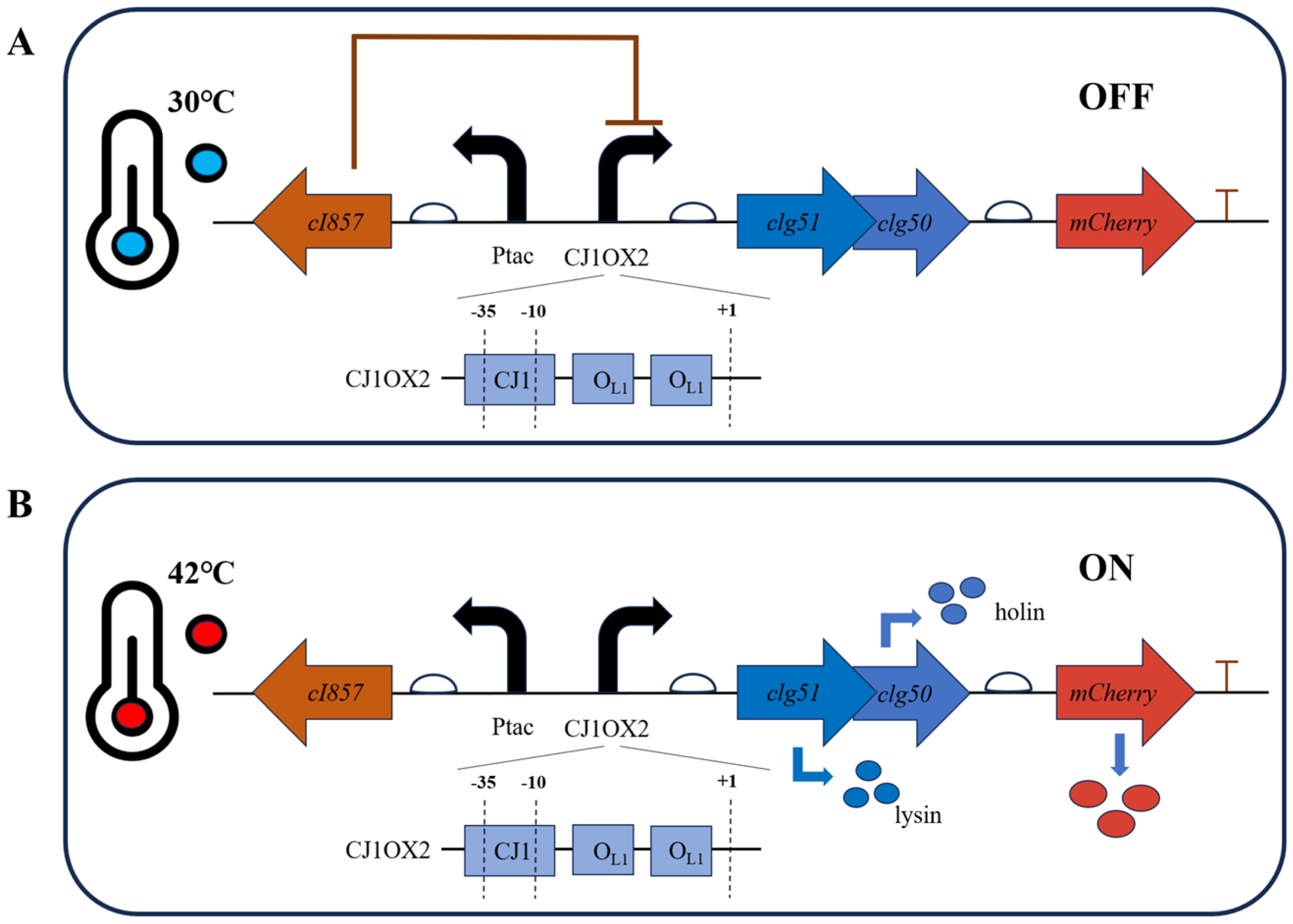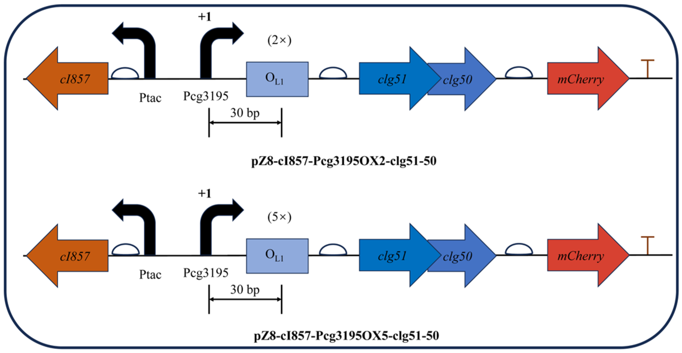 | pZ8-cI857-CJ1OX2 | Derived from pZ8-Ptac-clg51-50-mCherry by inserting the cI857 expression cassette and swapping the Pcg3195 for the CJ1OX2 to control the genes clg51, clg50, mCherry | This work |