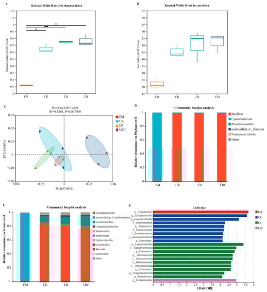 Bacterial community diversity index of sugar beet top–corncob silage (A,B). Principal coordinate analysis (PCoA) of β diversity in sugar beet top–corncob silage (C). Bacterial community composition at the phylum (D) and genus (E) levels and bacterial community difference analysis (LEfSE) (F) of sugar beet top–corncob silage. FM: Fresh sugar beet tops; CK: No additives; LB: Lentilactobacillus buchneri; LBC: Lentilactobacillus buchneri and cellulase combination treatment. (p values are shown as * 0.01 < p ≤ 0.05, *** p ≤ 0.001).